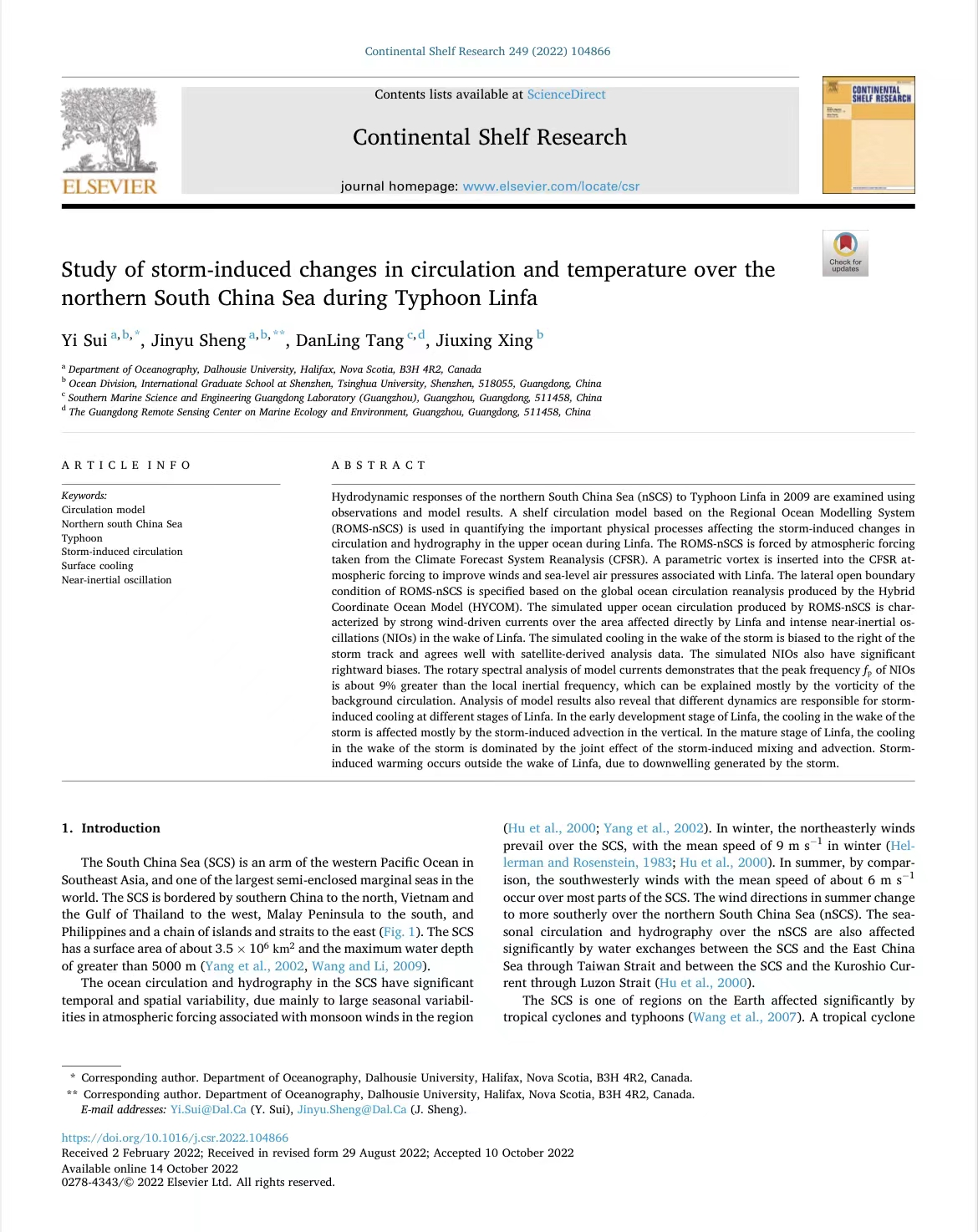 近日,海洋生态环境对台风的响应研究取得进展,相关成果Study of storm-induced changes in circulation and temperature over the northern South China Sea during Typhoon Linfa发表于海洋学领域SCI期刊Continental Shelf Research上。论文第一作者和通讯作者分别为加拿大达尔豪斯大学Yi Sui 隋艺和Jinyu Sheng 申锦瑜教授,广州海洋实验室教授、广东省海洋生态环境遥感中心主任Danling Tang 唐丹玲博士和清华大学国际研究生院Jiuxing Xing 邢久星教授共同完成该研究。