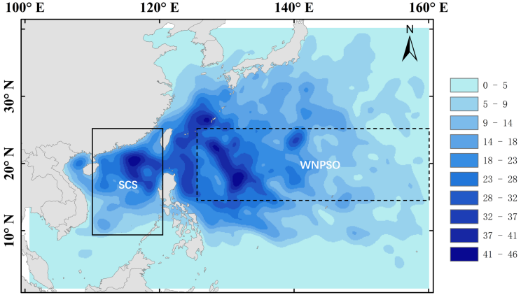 Fig. 1. The density of TC centers, with colors representing the number of TC centers at 6-h intervals from January 1998 to December 2018, and the spatial resolution is 0.1°×0.1°. The solid rectangle encloses the SCS; the dashed rectangle encloses the WNPSO.