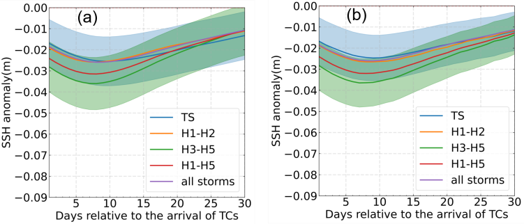 Fig. 5. (a) Temporal evolution of composite area-mean SSHA for a TC-centered 5°×5° box in association with passage of TCs based on the observations used in the testing stage. Error width are calculated as the standard deviation divided by the square root of the number of observations of the test set (i.e., standard error of the mean) and are shown by the width of the blue shading and green shading for TS and H3-H5 TCs, respectively. (b) As in (a), but from the predictions.