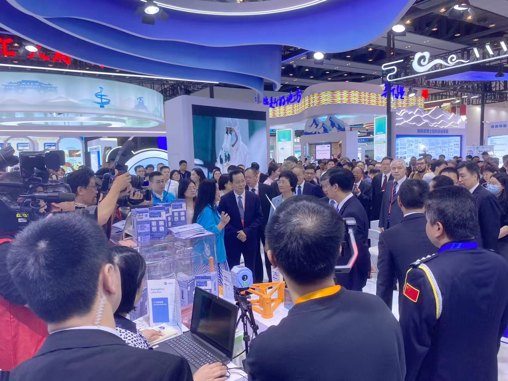 10月26日上午大会开幕式结束后,U团队展位迎来多位省部级领导调研考察:人力资源社会保障部党组书记、部长王晓萍,福建省委书记、省人大常委会主任周祖翼,福建省委副书记、省长赵龙,人社部副部长俞家栋,广东省人社厅厅长杜敏琪等莅临广东展区。王晓萍部长一行听取了唐丹玲教授关于高分辨率深海重力仪项目的现场汇报,对项目在高端海洋探测装备自主化方面的代表性给予了充分关注与肯定。该项目 还受到各层面的高度重视。
