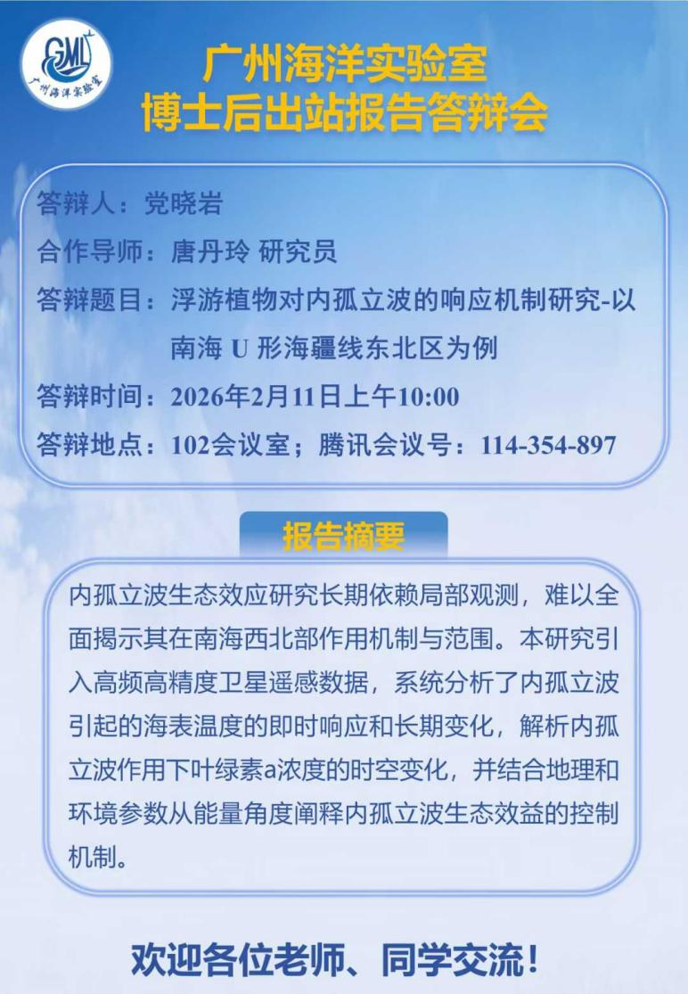 2026年2月12日,广州南沙资讯科技园博士后科研工作站召开博士后出站专家评审会,广州海洋实验室唐丹玲南海U团队的党晓岩博士汇报了博士后期间的工作。参加评委会的专家分别是中国科学院南海海洋研究院的李芊研究员、彭世球研究员,中国地质大学(武汉)的孙军教授和广州海洋地质调查局的邵长高高级工程师。李芊研究员担任本次专家评审会的组长。