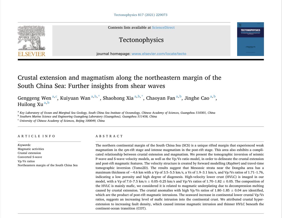 广州海洋实验室“南海生态环境权益综合研究U团队(广东省特支计划创新团队)”研究获得新进展。地质方向的夏少红教授课题组利用主动源OBS广角地震数据开展了纵横波速度结构研究,为深入认识南海北部陆缘岩浆活动及地壳伸展提供了重要信息。相关研究成果近日发表于Tectonophysics《构造物理》上。