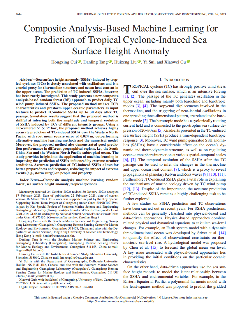 论文全文:H. Cui, D. Tang, H. Liu, Y. Sui and X. Gu, "Composite Analysis-Based Machine Learning for Prediction of Tropical Cyclone-Induced Sea Surface Height Anomaly," in IEEE Journal of Selected Topics in Applied Earth Observations and Remote Sensing, vol. 16, pp. 2644-2653, 2023, doi: 10.1109/JSTARS.2023.3247881.